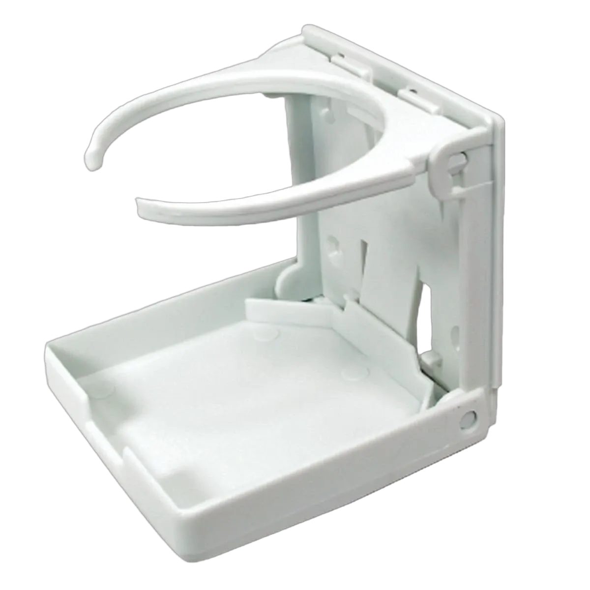 Mounts onto any flat vertical surface. When not in use the unit folds down to protrude only 24mm. Fold out the retainers to hold glasses up to 75mm in diameter. Moulded in tough U.V. stabilised plastic.