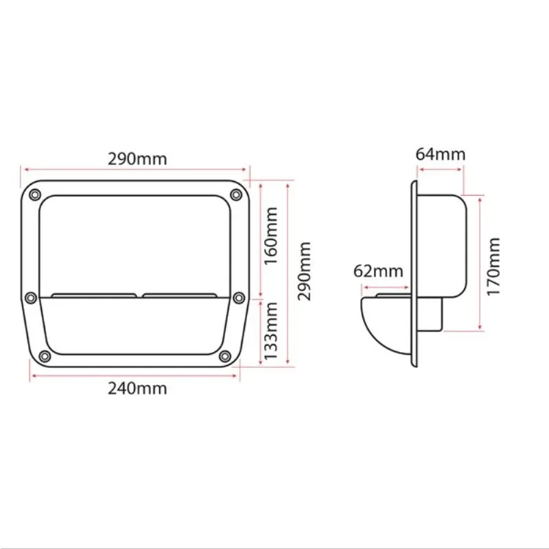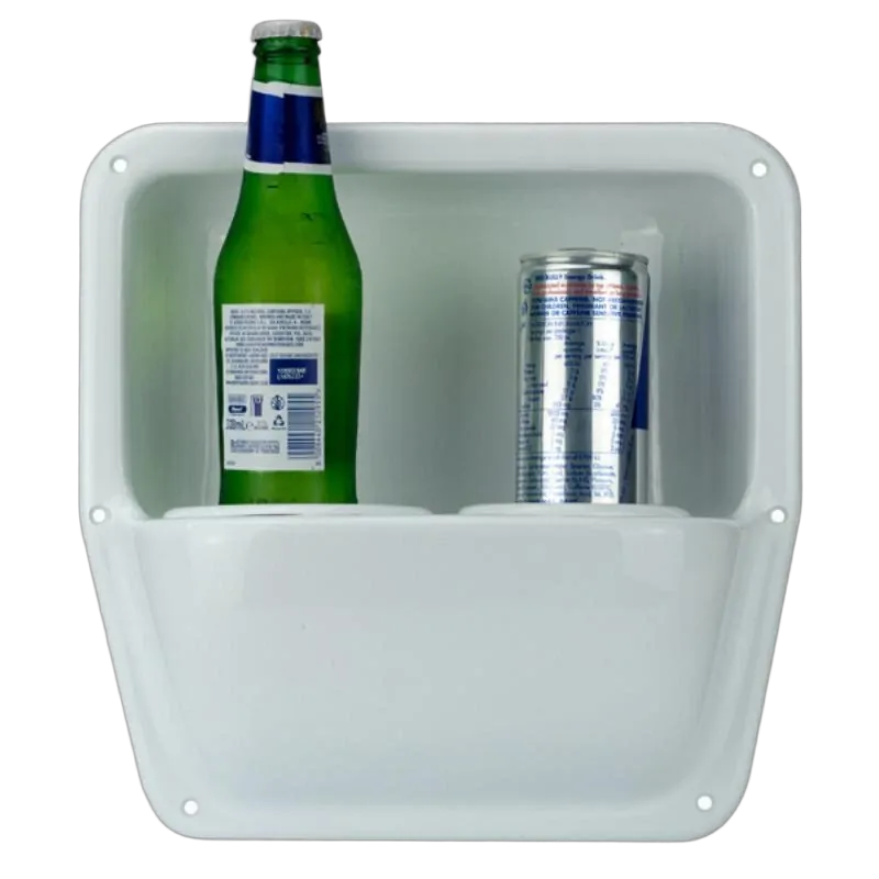 Vacuum moulded ABS plastic with a highly polished white finish. The Side Mount Double Drink Holder can hold 2 different sizes, a 70mm & 85mm and 160mm internal height.