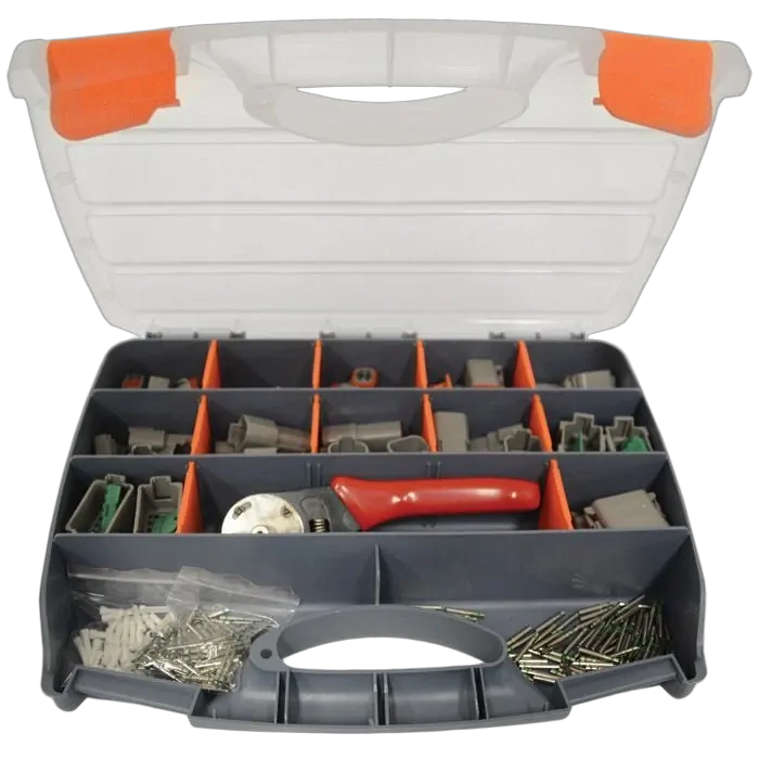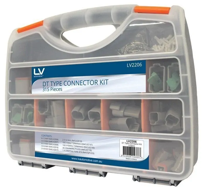 6 x 2 WAY (Ref: LV2006) 2 x 12 WAY (Ref: LV2018) 4 x 3 WAY (Ref: LV2007) 100 x MALE TERMINALS (Ref: LV2147) 4 x 4 WAY (Ref: LV2008) 100 x MALE TERMINALS (Ref: LV2149) 3 x 6 WAY (Ref: LV2016) 30 x BLANKING PLUGS (Ref: LV2170 ) 2 x 8 WAY (Ref: LV2017) 1 x CRIMPING TOOL #16 (Ref: EQP-033)