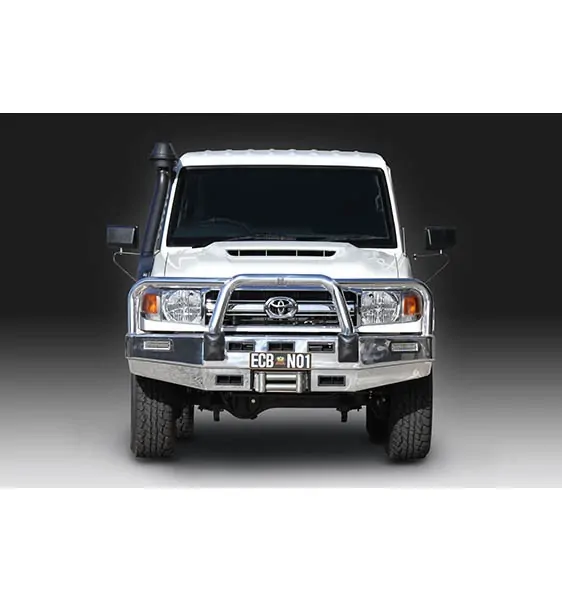 For the ultimate in frontal protection you will find it hard to go past the strength, quality and style of the ECB Winch Compatible Big Tube Bullbar for your Toyota Landcruiser 79 Series. The single piece channel is fully welded and manufactured from high tensile, structural grade alloys to provide maximum strength. This no compromise design is engineered to accommodate up to a 9,000lb low mount winch that is attached to the chassis as part of the specifically designed steel mounting system ensuring a neat and sturdy fit. Our Winch Compatible Big Tube Bar® incorporates a full width, braced lower protection skirt. ECB LED light combinations, air directional cooling vents and an aerial bracket are all standard features. Your ECB Winch Compatible Big Tube Bar® is available in a mirror finished polished alloy or choose from one of our low maintenance powder coat finishes. Our ECB Winch Compatible Big Tube Bar® is proudly manufactured in Australia and we offer a lifetime warranty.