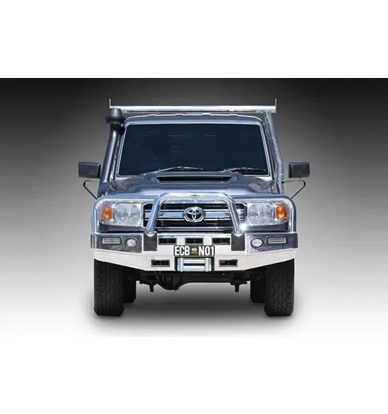 For the ultimate in frontal protection you will find it hard to go past the strength, quality and style of the ECB Winch Compatible Big Tube Bullbar for your Toyota Landcruiser. The single piece channel is fully welded and manufactured from high tensile, structural grade alloys to provide maximum strength. This no compromise design is engineered to accommodate up to a 9,000lb low mount winch that is attached to the chassis as part of the specifically designed steel mounting system ensuring a neat and sturdy fit. Our Winch Compatible Big Tube Bar® incorporates a full width, braced lower protection skirt. ECB LED light combinations, bumper lights, air directional cooling vents and an aerial bracket are all standard features. Your ECB Winch Compatible Big Tube Bar® is available in a mirror polished finish or choose from one of our low maintenance powder coat finishes. Our ECB Winch Compatible Big Tube Bar® is proudly manufactured in Australia and we offer a lifetime warranty.