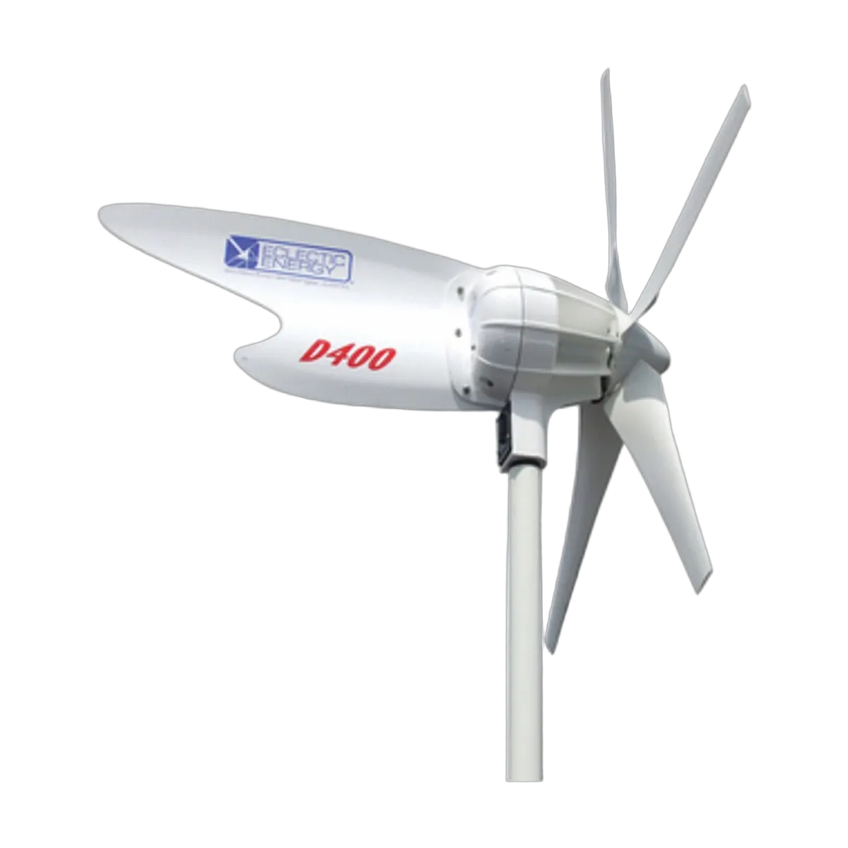 Eclectic Energy Wind Generator - D400 Eclectic Wind Generator D400 24V 337712 The D400 wind generator is designed for battery charging in marine and terrestrial applications. It is exceptionally quiet and vibration free in operation. This innovative machine is extremely efficient in low wind speeds, yet is capable of sustained power outputs of up to 600 watts in higher winds. Distinctive in design, the D400 is superbly engineered for long, trouble free operation. Features Highly efficient and productive at all wind speeds Virtually silent and vibration free in operation Robustly constructed for a long service life Corrosion resistant materials used throughout Available in 12V and 24V models Rated output 235W at 22kts; 420W at 28kts Optional external regulator produces maximum charge to the batteries Rotor 1.1m diameter Turning circle 700mm Two year warranty [table id=2413 Accessories 337720 TB12V Regulator 12V incl. load resistors 337722 TB24V Regulator 24V incl. load resistors
