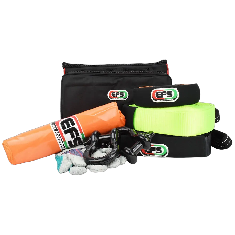 SNATCH STRAP, BAG, GLOVES, DAMPER 20M WINCH EXTENSION STRAP, 2 x 4.5T BOW SHACKLES, TREE TRUNK PROTECTOR EFS Essentials Winch Recovery Kit