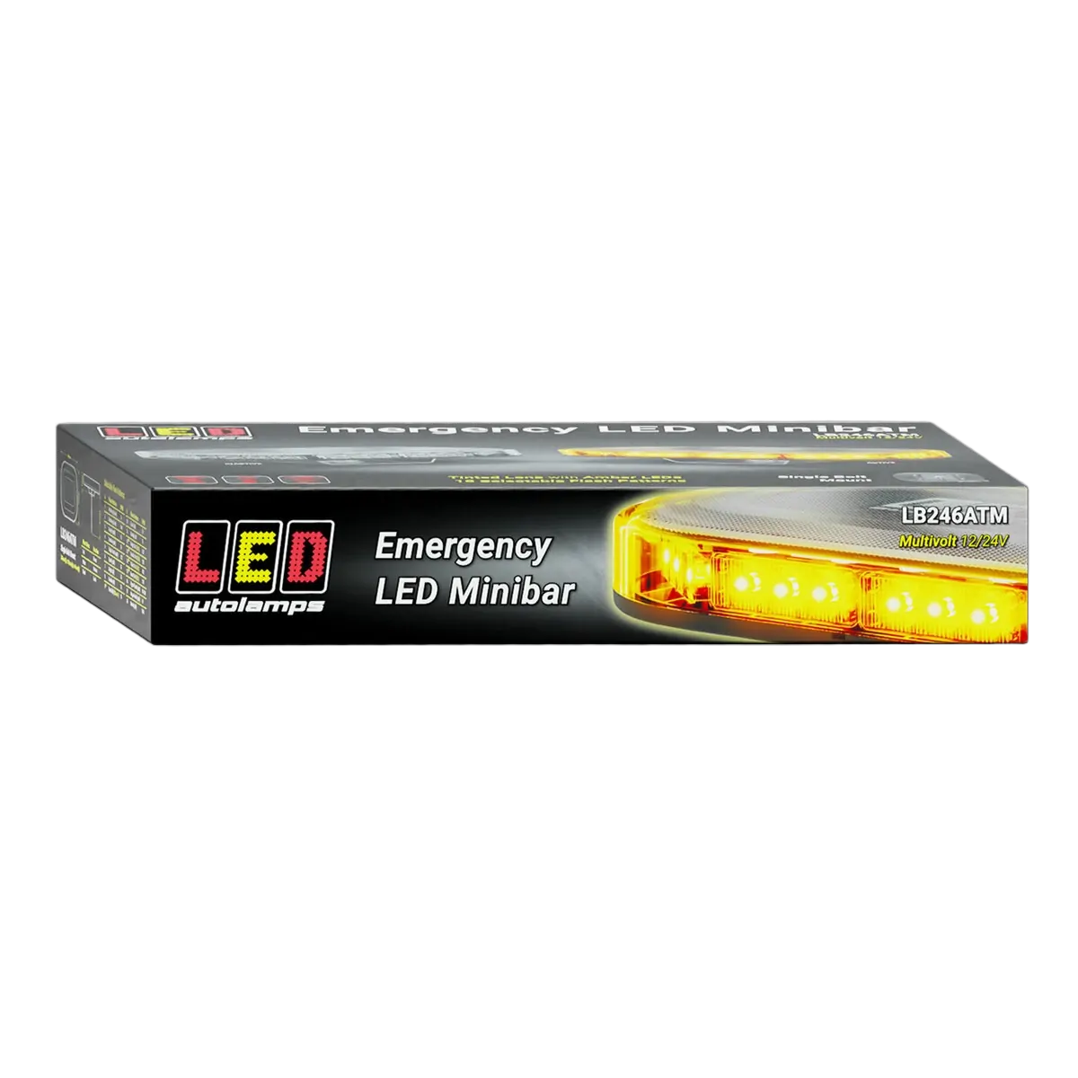 Amber Emergency Mini Light Bar, Tinted Lens With Amber Leds, 18 Selectable Flash Patterns, 12-24 Volts, 246Mm X 171Mm X 64Mm, Single Bolt Mount, Box, 5 Year Warranty