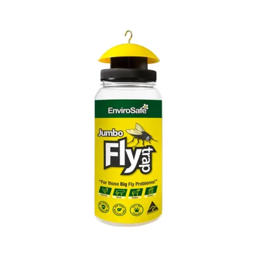 Australia’s #1 fly trap system for big fly problems! The EnviroSafe Jumbo Fly Trap is designed to attract and catch a wide range of Aussie flies – in jumbo quantities! Ideal for placement in areas which attract a lot of flies – Chook sheds, stables, cattle yards and rural properties. Each trap comes with our unique Jumbo EnviroSafe Eco-Bait – a highly effective, non-toxic bait that is irresistible to flies, attracting them into the trap where there is no escape!