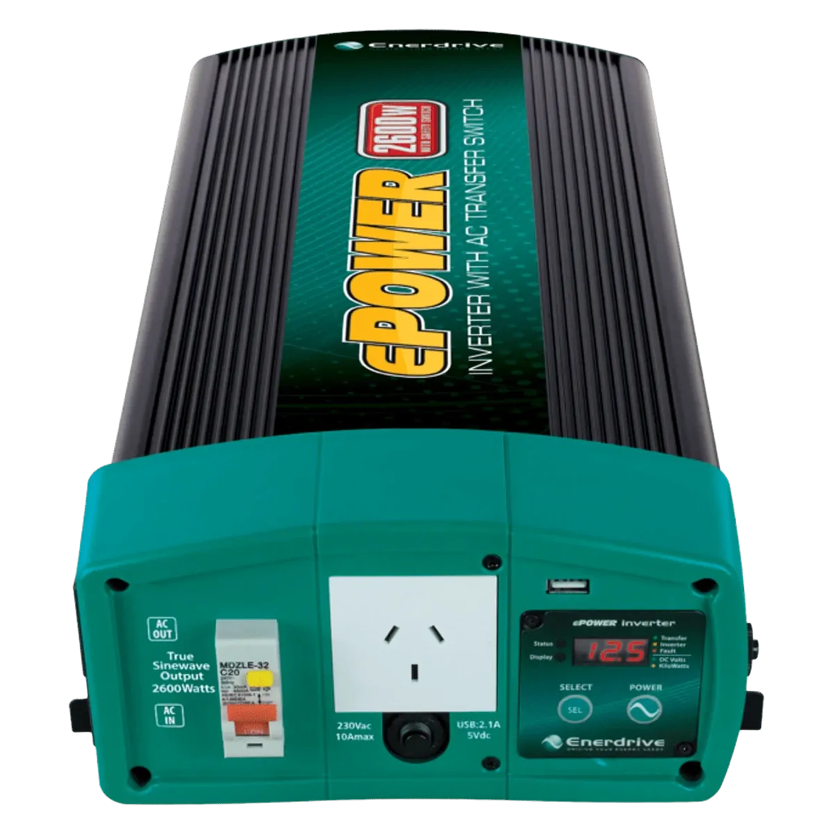The ePOWER 2600W Inverter with AC Transfer & Safety Switch is one in a family of affordable, high quality, professional level inverters by Enerdrive. By using the latest power conversion technology, ePOWER inverters deliver clean and energy efficient true sine wave AC power from your DC supply.