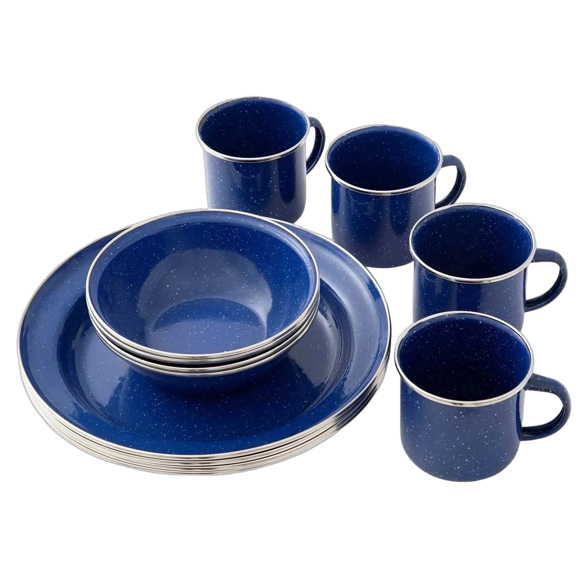 Serve up your favourite camp food in style with the Explore Planet Earth Enamel 12 Piece Camping Set