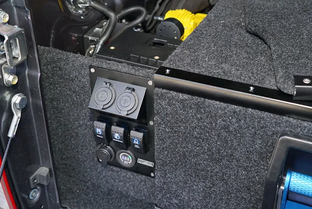 - 3 x labelled, illuminated Rocker switches (Aux Light, Compressor & Water Pump)