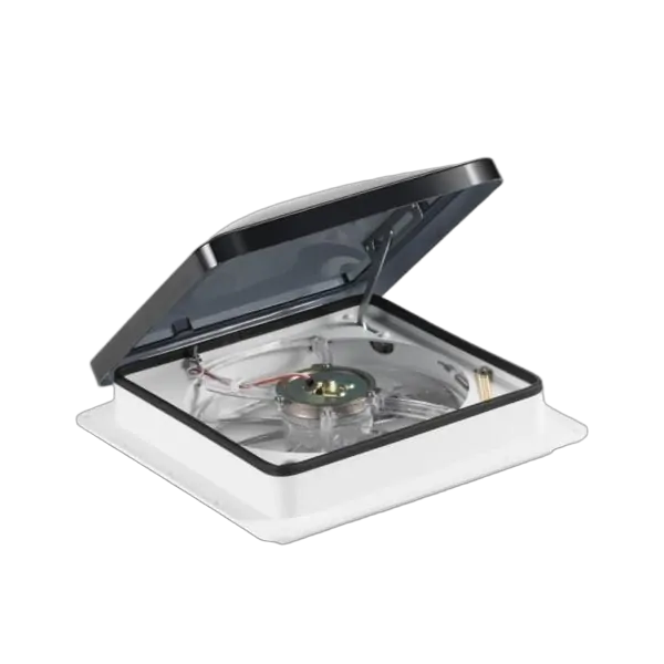 This model is activated when the three speed switch is turned to any of the three speed selections. The dome cover is opened when the dome up switch is activated and closed when the down feature is selected. To activate the fan blade, the built-in thermostat must be turned to a lower temperature than the current interior temperature. The fan will shut off when pre-selected temperature is reached, but dome stays open for ventilation until the down feature is selected or the built-in rain sensor automatically closes the dome. A built-in manual knob can be used to close the dome in an emergency or to adjust the dome to a desired partially open height or to override the rain sensor. For storage, the dome switch must be in the down position and the three speed switch to the off (0) position. The vent has a reverse switch for either intake or exhaust. The fan draws only 3 amps. max. and has a built in 6 amp fuse which is easily accessible on the face.