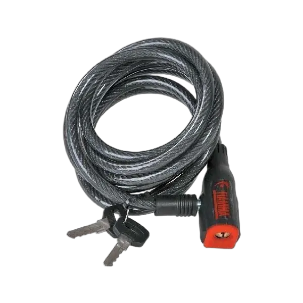 Handy anti-theft cable made of black plastic-coated steel with incorporated padlock. Delivered as standard with 2 keys. Length 250cm. 1 piece per packaging.