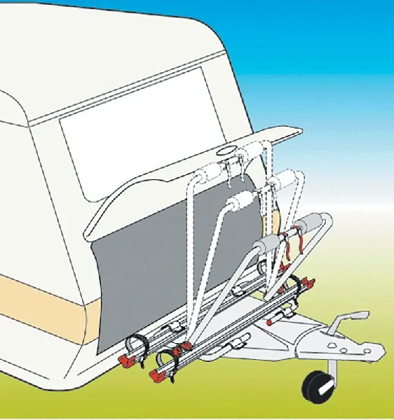 Place the first bike closest to the caravan and set the second bike facing the opposite way. This stops the pedals and handlebars from clashing. Turn the front wheels slightly so the handlebars don’t press against the caravan body. Secure each wheel and frame using the supplied straps, pulling them tight so the bikes don’t move. If you want extra stability for long trips, you can add a Fiamma Bike Block Pro to hold them even firmer.