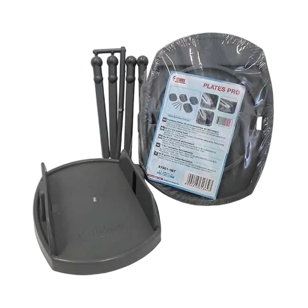 A set of four anti-sinking bases with four plastic pins to fasten to the RV's drop down legs.
