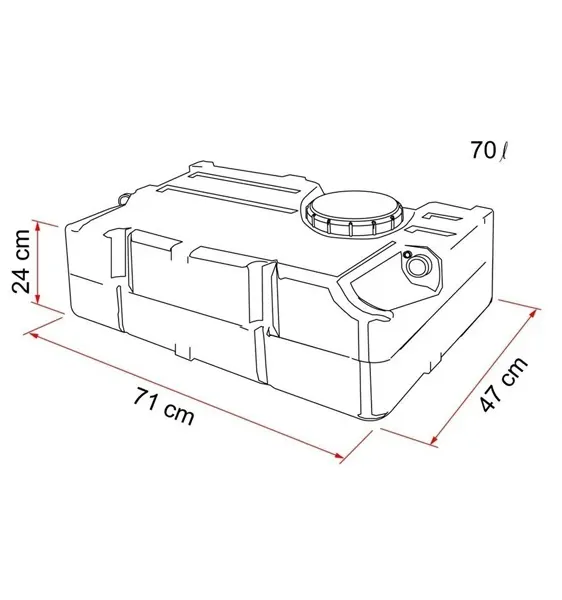 The Fiamma 70Lt fresh water tank is made of non-toxic material and can be installed either vertically or horizontally. Comes with 38mm inlet all necessary fittings for installation.