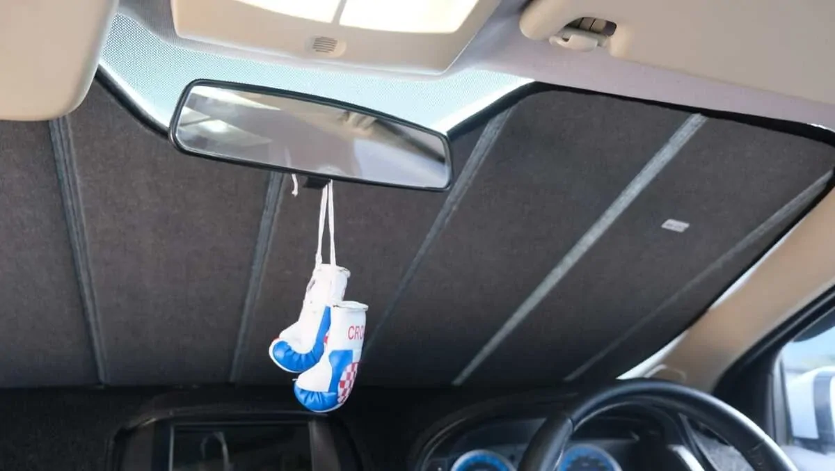 Note: Our custom sun shades block out a significant amount of light and UV rays that enter from the front windscreen, however due to the angle of the front windscreen and additional sensors or different mirror shapes/sizes available for different models, there may be slight gaps around your rear-view mirror or sides to allow the sun shade to fit.