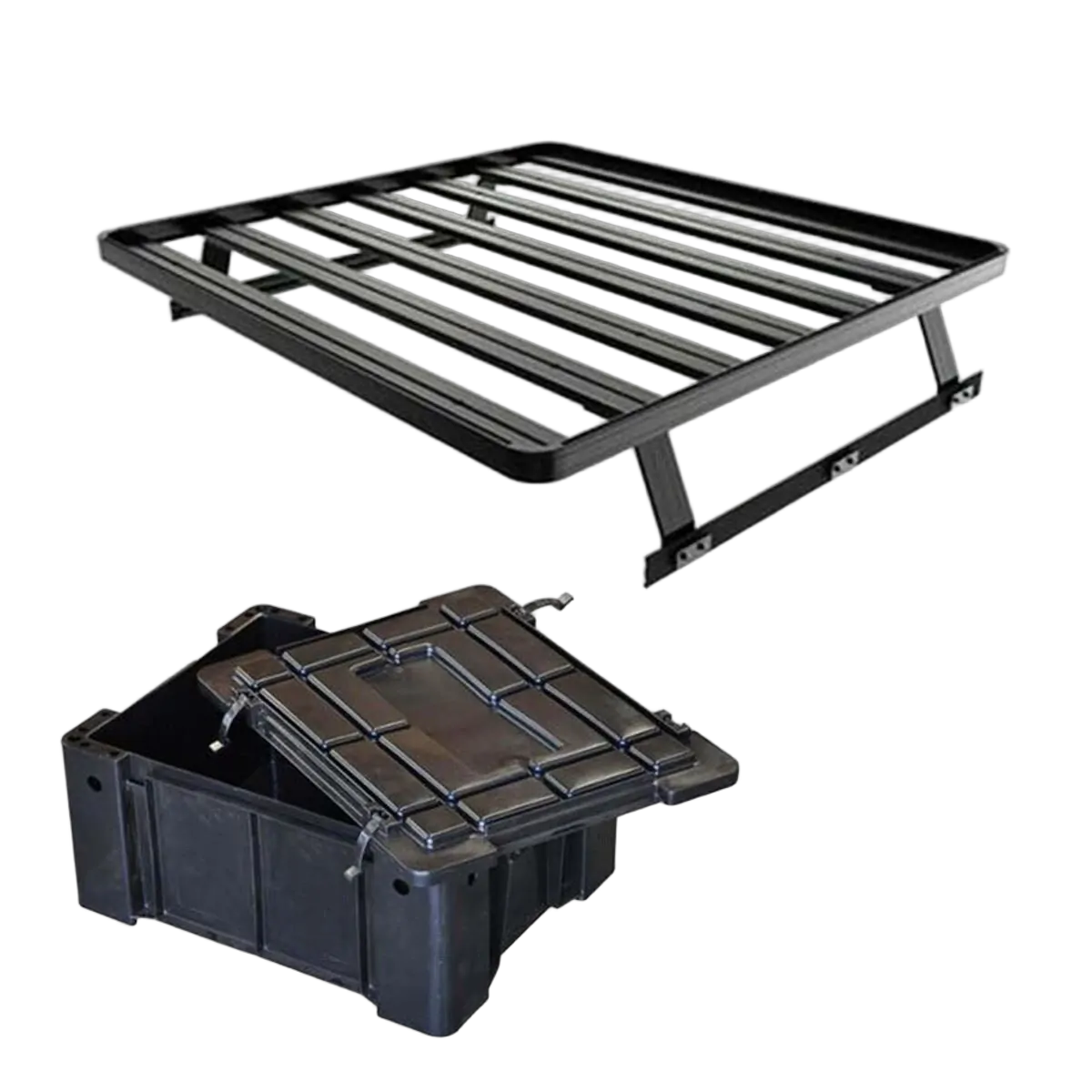 This kit creates a full size rack that sits above your For Ford Ranger Super Cab 2-Door 1998-2012 truck bed. This Slimline II cargo carrying rack kit contains the Slimline II tray (1255mm x 1358mm), 2 Tracks, and 4 Pick-Up Truck Bed Universal Legs that fit into the Tracks.