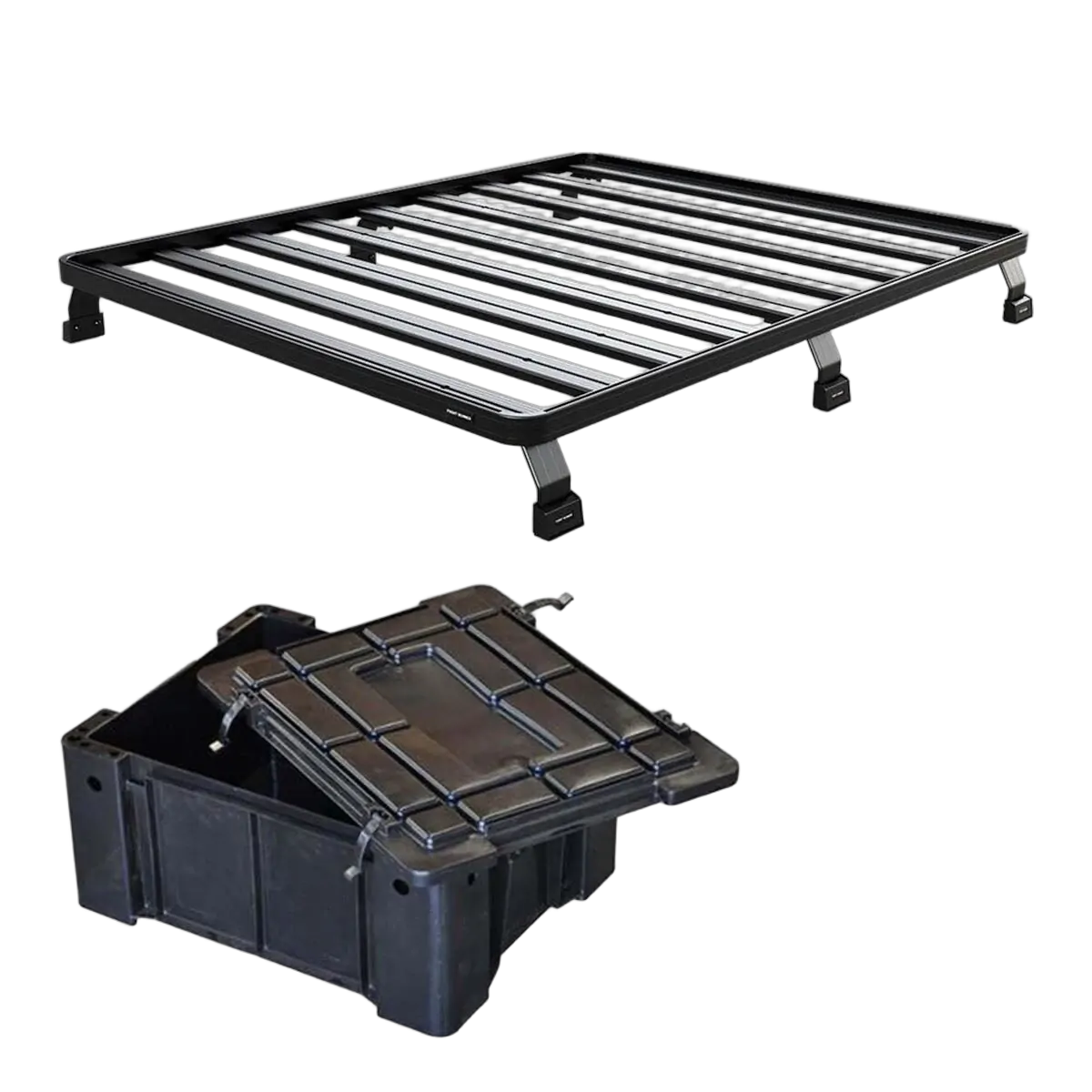 This kit creates a full-size rack that sits above your Pickup Truck's load bed when fitted with a Roll Top Cover. This Slimline II cargo carrying rack kit contains the Slimline II tray (1475mm x 1560mm) and 6 Pickup Roll Top Leg Mounts that fit into the existing factory/OEM tracks in your Roll Top Cover.