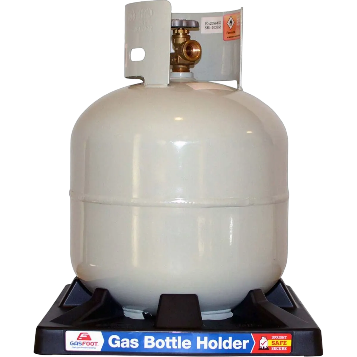 Gas Foot is a slimline stand for 3.5kg to 9kg gas bottles, designed to keep them upright, safe and secure. It is ideal for use when transporting, using outdoors on uneven ground, or to protect decks and other surfaces from being scratched. Gas Foot is made in Australia from recycled materials, with a clever design that transfers the surface area of the bottle into a square profile. This uses the bottles own weight to better secure it.
