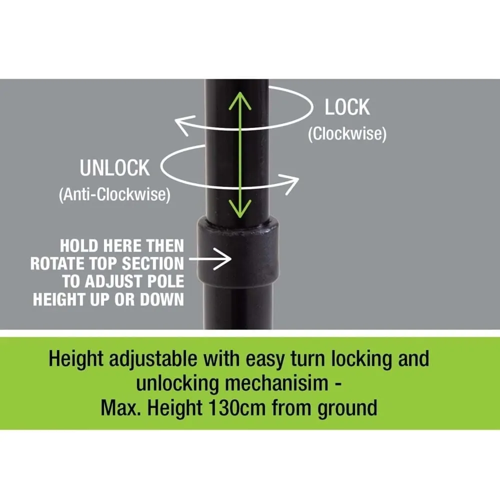 Height adjustable with easy turn locking and unlocking mechanism - Max. Height 130cm from ground |