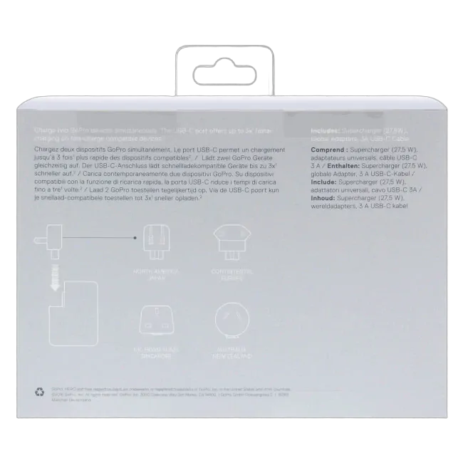 The fastest way to charge your GoPro, the 27.5W Supercharger lets you charge two GoPro devices simultaneously - anywhere in the world. The USB-C port offers 20 to 70% faster charging on fast-charge compatible devices1 compared to using a conventional charger.2 You can also continuously power your GoPro during longer captures. Includes interchangeable AC plugs for US, UK, EU and AU style wall sockets.