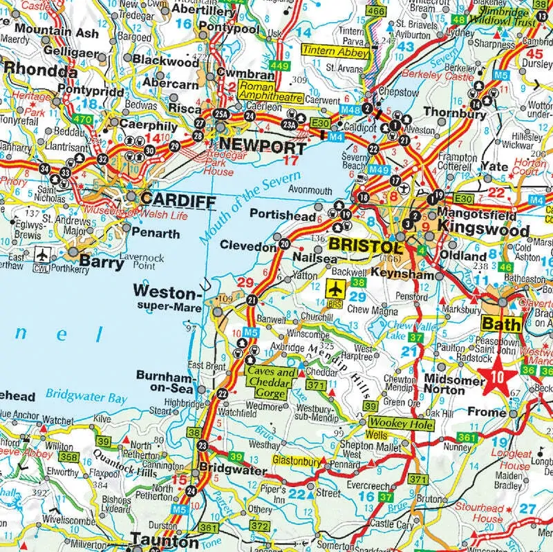 A map of Great Britain and Ireland at a detailed scale of 1:800,000. Places of interest, and cultural and natural features, are highlighted. Noted on the map are national parks, points of interest, road distances and tourist routes. The map also includes transit maps for the major cities.