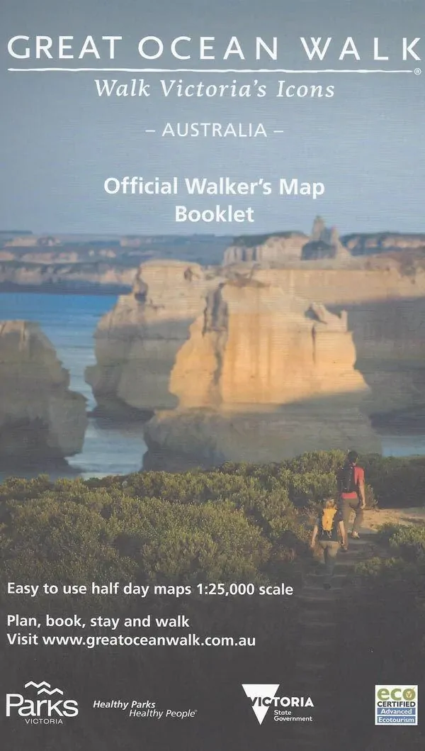 The Great Ocean Walks Guide Book by Parks Victoria covers walk from Apollo Bay to Twelve Apostles along the Great Ocean Road in Victoria. This official walker's booklet contains maps with track notes and information broken down into easy half day sections (the Great Ocean Walk Map cut into two half day maps). This map covers the entire Great Ocean Walk from Apollo Bay to The Twelve Apostles and promises eight of the most spectacular days of walking you will ever experience. The walk has it all: Tall forests, coastal heathlands, wild ocean beaches, rocky headlands, amazing views and quiet coves.