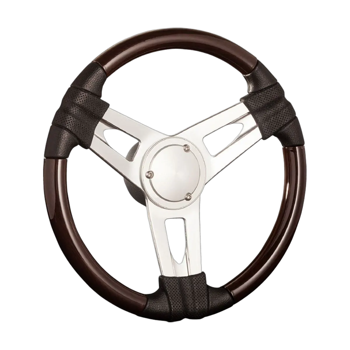 Polished aluminium spoke with black urethane grip and wood look inserts (38cm diameter). Suits a standard 3/4″ tapered shaft.