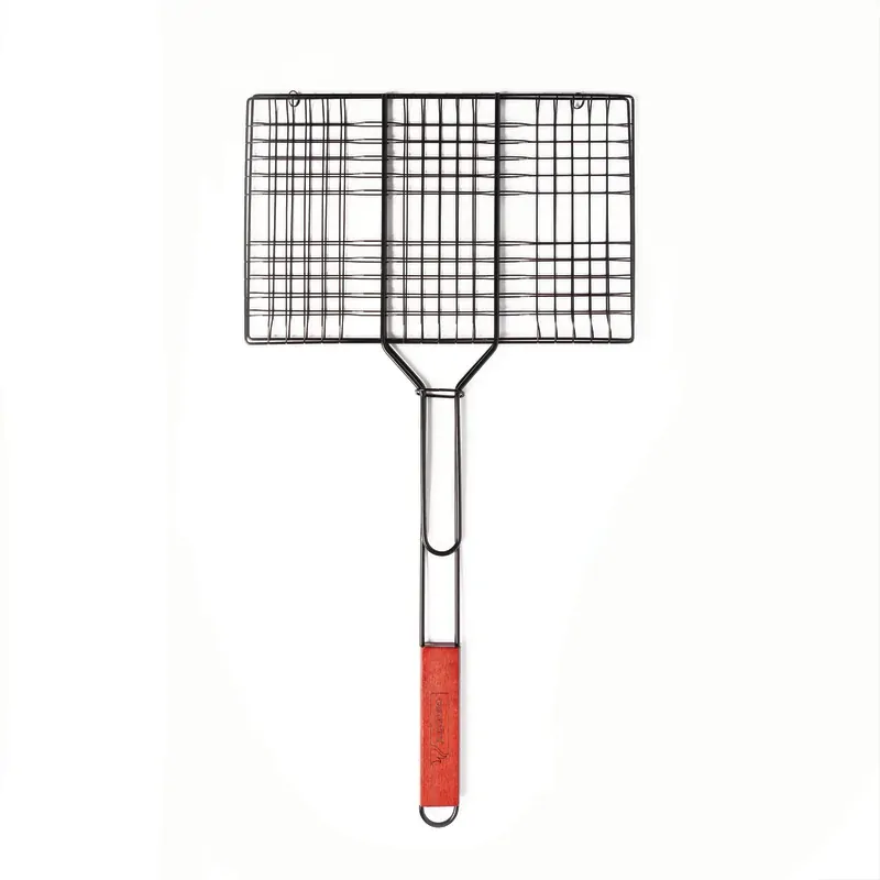 A non-stick enamel-coated steel grill basket designed for easy BBQ grilling. Featuring a long wooden handle, it's ideal for burgers and steaks, making outdoor cooking easier.