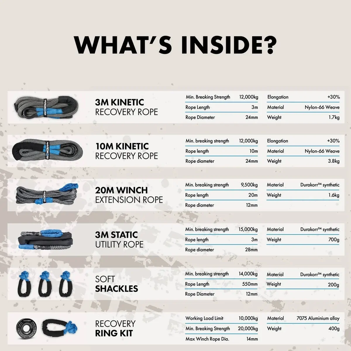 For extended reach, the 20-meter, 9,500kg winch extension rope is included, allowing you to tackle even the most challenging recovery scenarios. The 3-meter, 15,000kg utility rope provides additional versatility for various tasks.