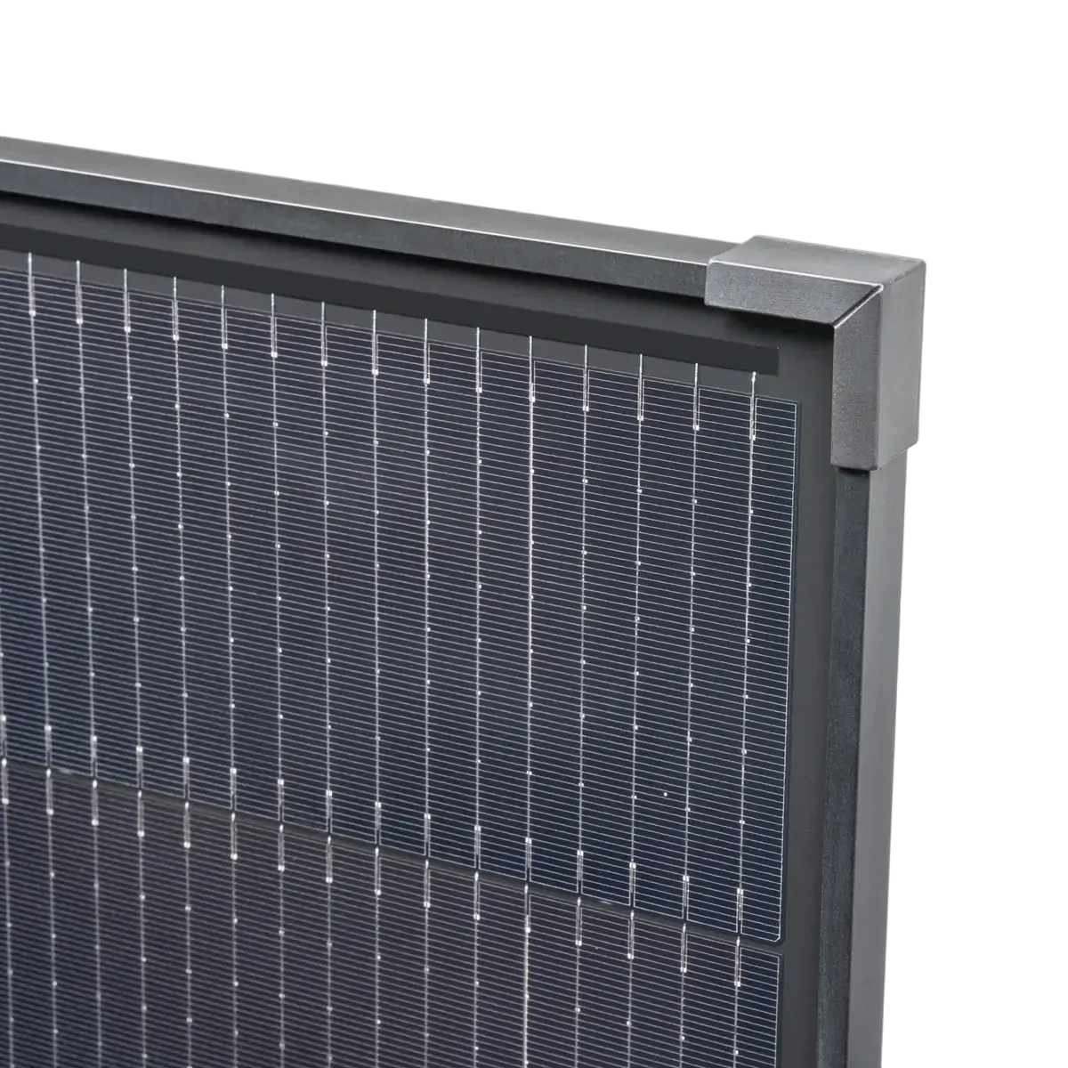 The A-grade monocrystalline solar cells, renowned for their efficiency and durability, are protected by a 3.2mm tempered low-iron glass covering. This material is optically clear and offers exceptional resistance to impact from hail, stones, and accidental knocks. The sleek black anodized aluminum frame enhances the appearance of your setup while ensuring long-lasting performance in harsh conditions.