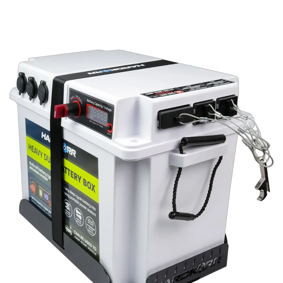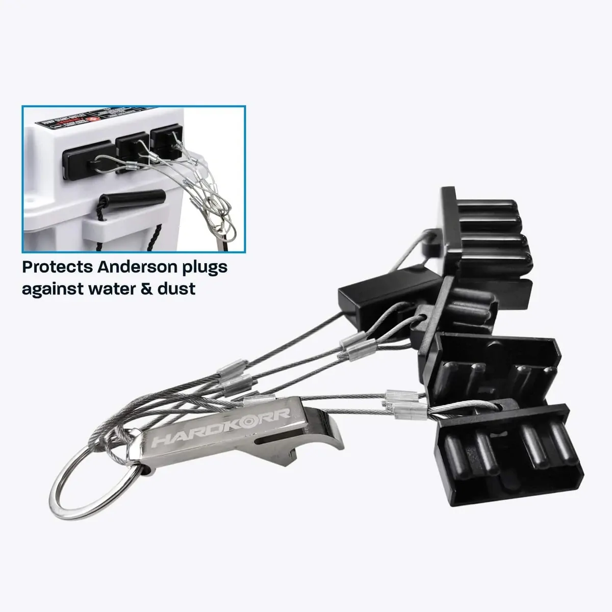 This set of five Anderson plug covers fits neatly over the 4 x 50A Anderson plugs and 1 x 175A Anderson plug on the Hardkorr battery box. It provides ingress protection to an IP65 standard, making it particularly handy in rain showers, in dusty environments and when the battery box is being stored.