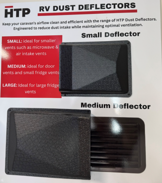 The HTP Dust Deflector is designed to allow air to flow through the vents on your caravan while guiding dust particles away from the intake areas. Fit the dust deflector over the vent, with its open end oriented toward the rear of the caravan. This placement ensures that as the caravan moves forward, the deflector guides air and dust away from the vent, allowing clean air to enter from the rear. The rear-facing open end leverages the natural airflow, minimizing the amount of dust that reaches the vent while still maintaining effective ventilation.