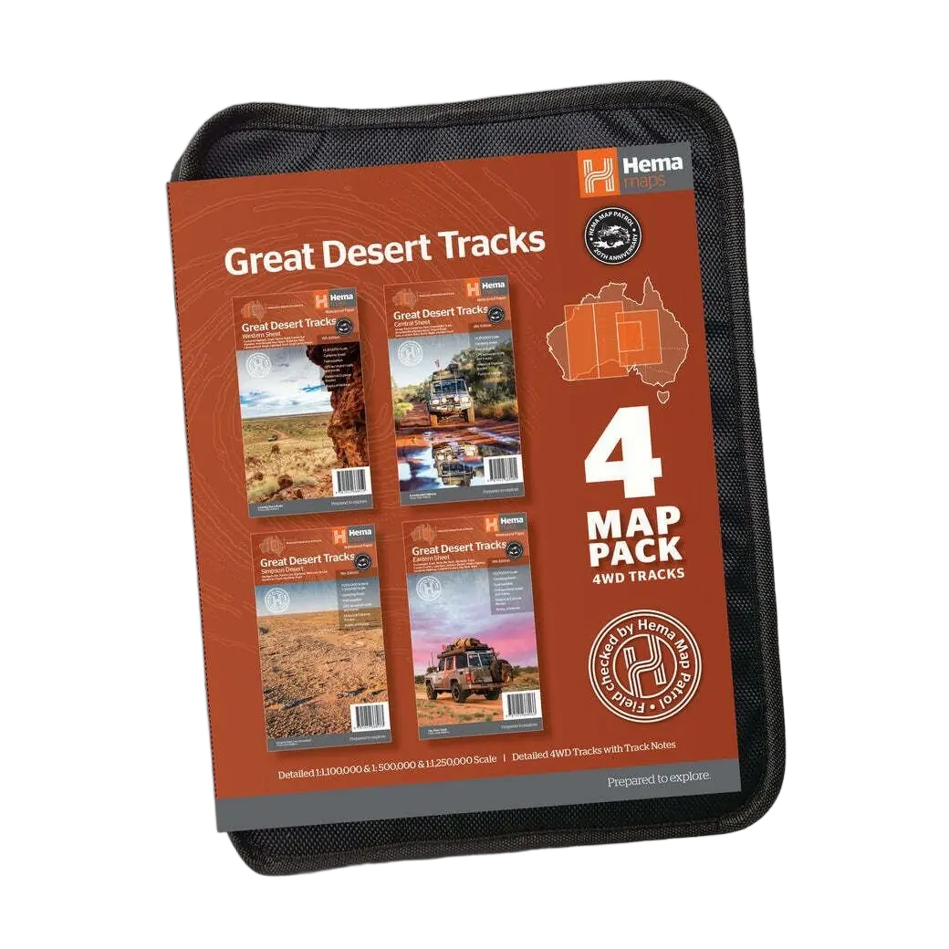 Hema’s Great Desert Tracks Map Pack The Great Desert Tracks Map Pack presents Hema's iconic Great Desert Tracks series in a soft and durable map wallet. Explore the arid centre with these comprehensive maps that traverse Australia's desert regions — each map waterproof, tear proof and field-checked by the Hema Map Patrol to ensure the accuracy and detail necessary for desert travel. With complete coverage of the outback region of Australia's centre, the Great Desert Tracks Map Pack is the perfect navigation guide for every desert track and journey throughout Australia.