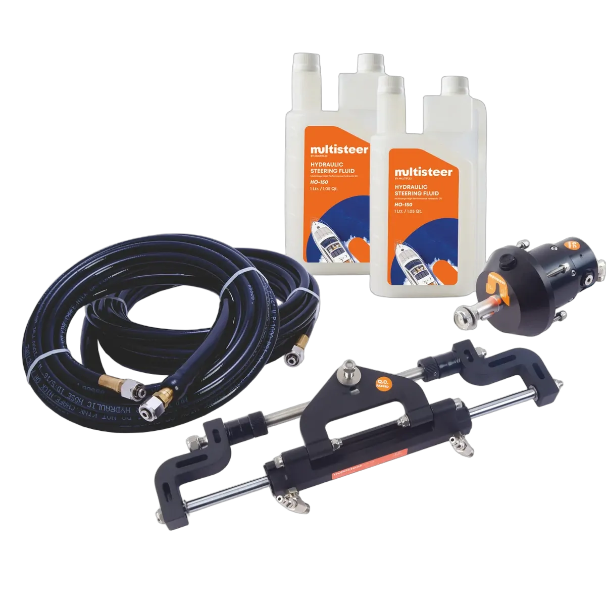 Suits most outboards 90HP to 250HP. Includes a 23cc 7 piston front mount helm pump, a single front mount balanced outboard cylinder, 2 x 7.5 meter thermoplastic hydraulic hoses with re-usable end fittings, 2 x 1 Litre hydraulic oil and an oil filler kit.