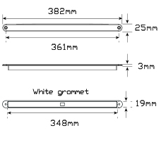 Mount onto flat surface horizontally. Push lamp and grommet into cutout (cut out 340mm x 19mm) in mounting surface, run wires through back and fix with screws supplied at both ends. Please refer to ADR13/00 for mounting instructions.