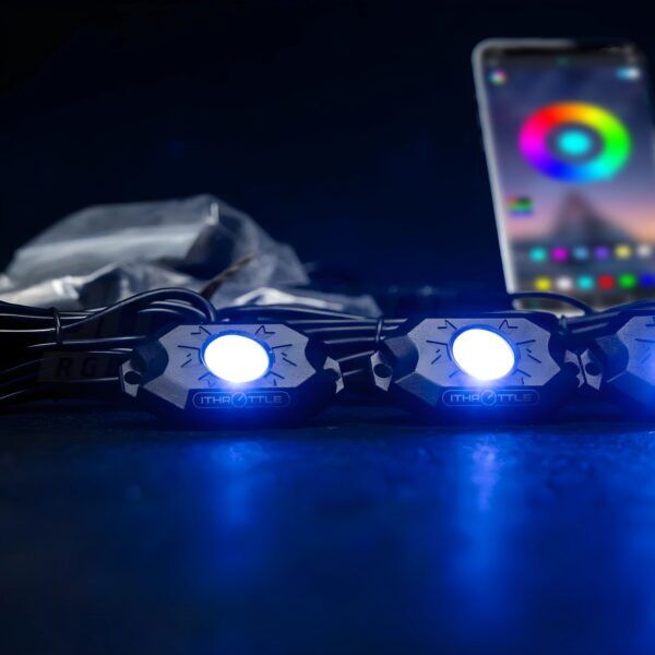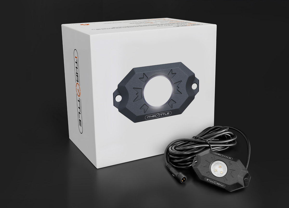 The iThrottle multi-function, multi-colour RGB Rock Lights come included with wiring, an on/off switch and an in-line fuse. Simply download the free Android or App Store app, which will allow you to choose between 5 primary colours as well as infinite shade variations. The Bluetooth app allows you to customise brightness, colours or flash function.