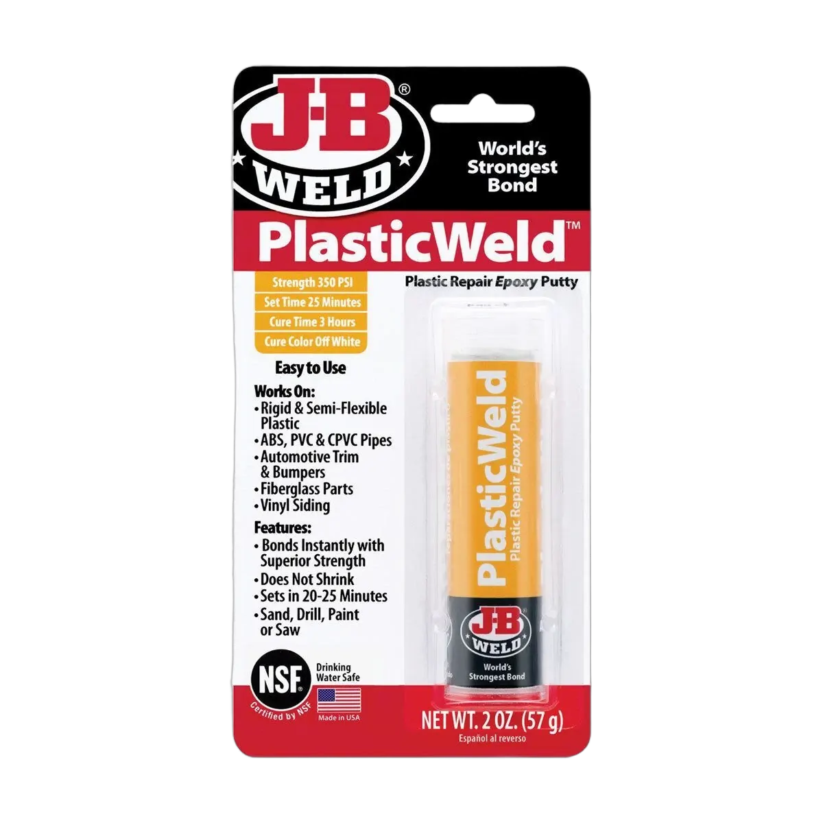 PlasticWeld cures to an off-white colour, is rated at a tensile strength of 350 psi. Does not adhere to polyethylene, polypropylene or some other plastics.