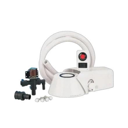 Includes solenoid valve with siphon breaker which positively eliminates any backflow from the toilet to the boats fresh water system, and other components required, ready to bolt on to your existing toilet bowl.