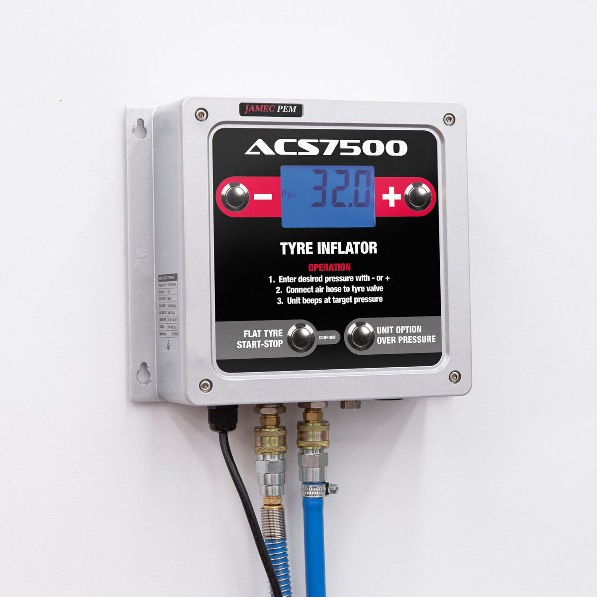- OPS (Over Pressure Setting) function that allows the tyre to be inflated to a certain pressure then deflates automatically to a normal operating pressure, used for seating tyres on rims