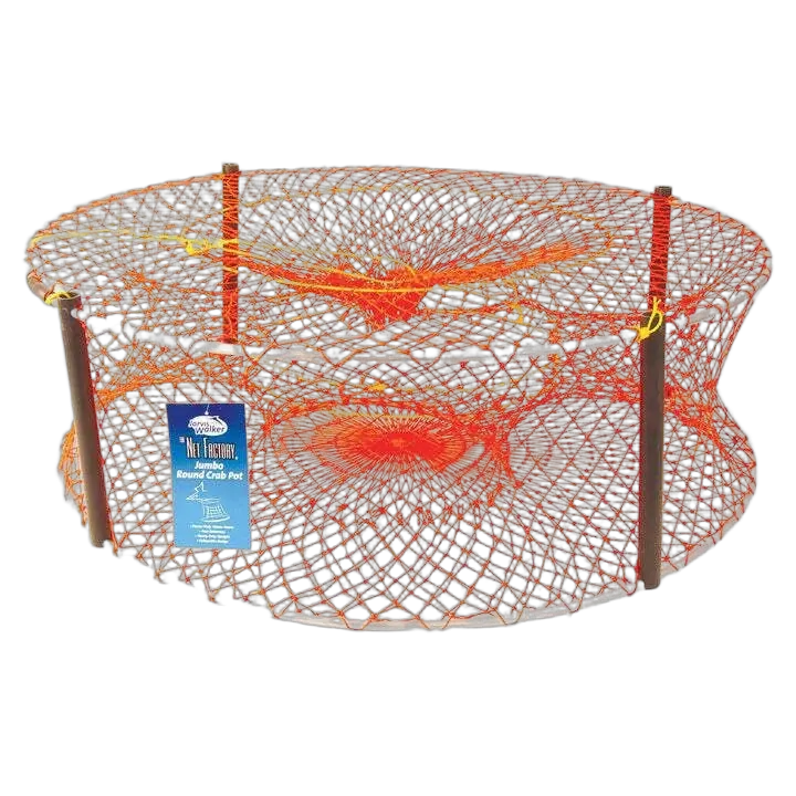 JUMBO 4-ENTRY CRAB POT! The Jumbo Round Crab Pot has a 900mm diameter and 270mm PVC upright support stays. This collapsible model is a heavy-duty unit. It features four entry holes, a strong 10mm-diameter galvanised frame and heavy-duty nylon mesh for ultimate durability.