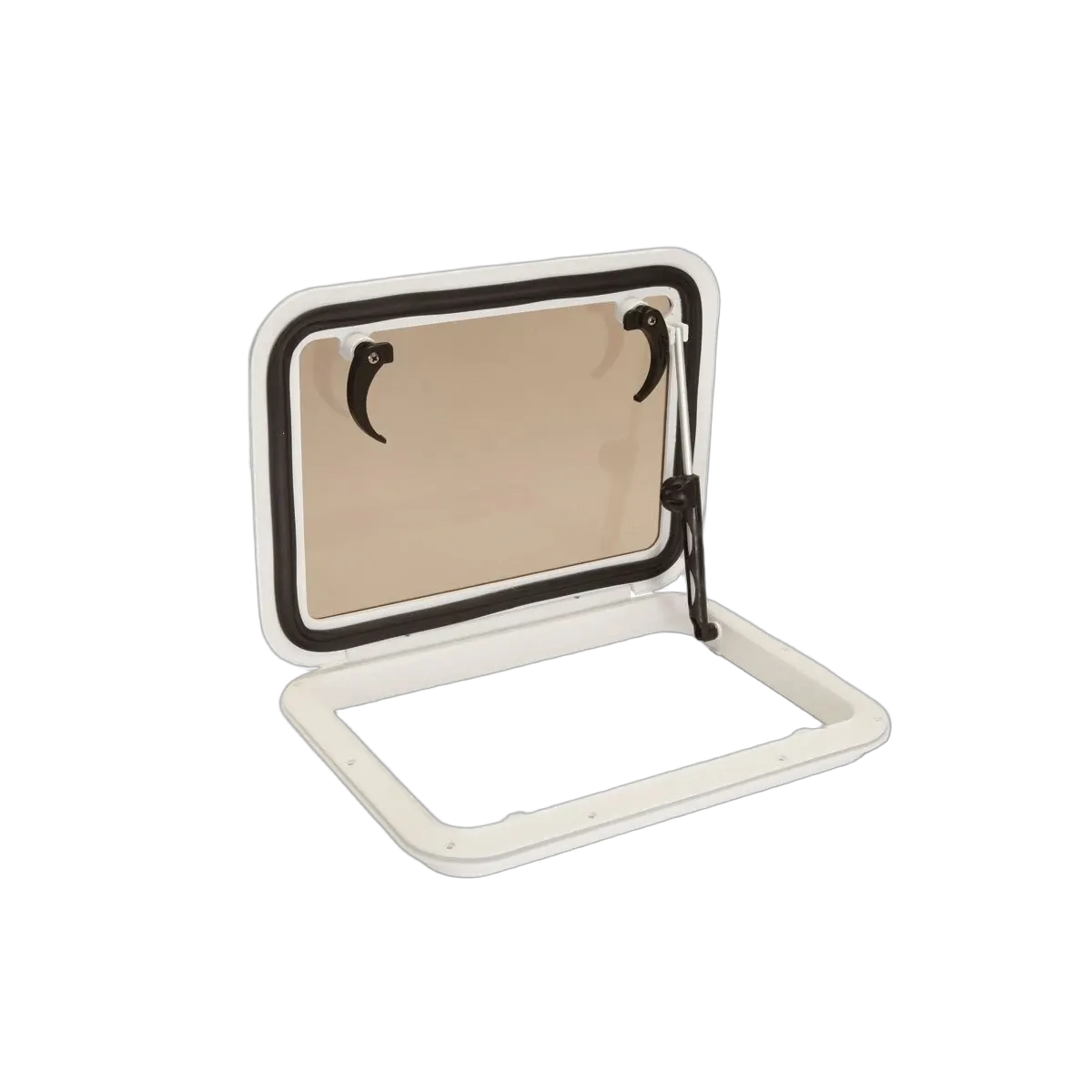 H2 Jim Black Ventilation Hatches A range of low profile white ventilation hatches featuring high impact U V resistant Saralon resin moulded frames which resist warping and are impervious to harsh chemicals such as acetone The 6mm light bronze finished tempered glass lens offers extreme strength and durability and is moulded into the frame to help protect against water intrusion and lens separation Ventilation hatches are fitted with an adjustable strut with a friction locking knob allowing the hatch to be held at the desired angle plus internal closing handles for security The heavy duty hinge system and strut design also allows the hatch to be opened 180 for a lay flat effect The deck frame features a hidden fastening design when closed and utilises stainless steel hardware where appropriate All hatches have a 25mm internal flange and are supplied complete with matching trim ring with insect screens available separately Features U V stabilised Saralon resin mo