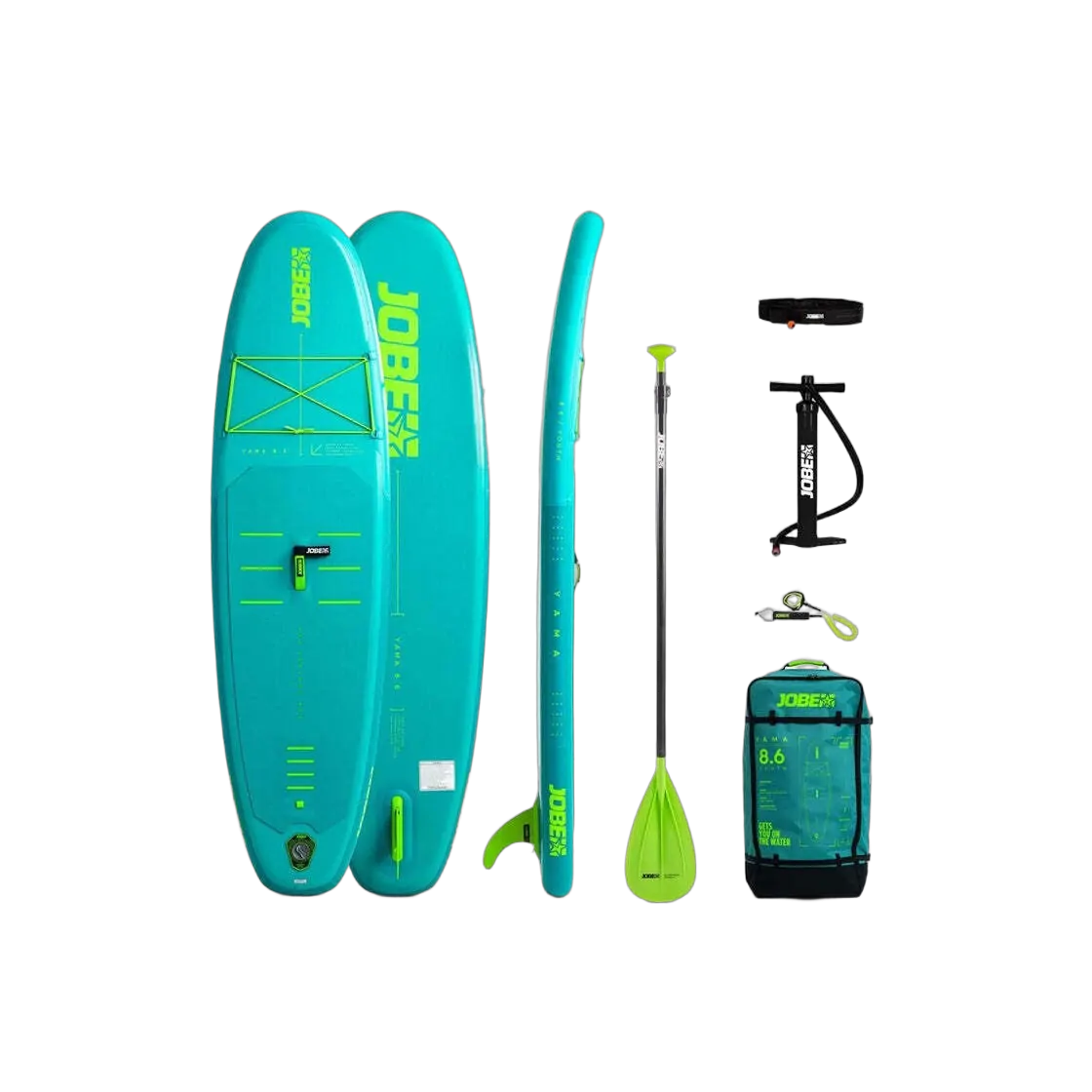 Introducing the Jobe Yama 8.6 Inflatable Paddle Board Package! It may be our smallest SUP but it is still loaded with new features like our "EZ Lock Fin and lightweight X-stitching construction for a higher quality experience and construction! Wherever your water starts, the inflatable Yama stand up paddle board will meet you there! The package includes everything you need to get out on the water! Plus with its overall weight of only 6kg pounds this SUP board is super easy to transport from adventure to adventure!