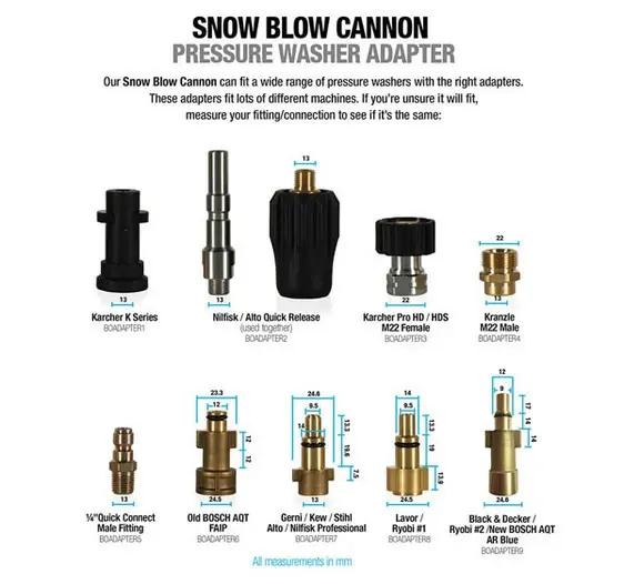 This is a selection of adapters to hook your Snow Blow Cannon up to many different pressure washers. If you don't know which one you need, please have a read of this article from Bowdens Own to choose the right one for you.