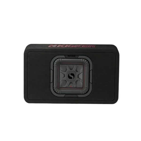 Genuine KICKER L7T Subwoofer Included Angled Design for Excellent Fit Heavy Internal Bracing Single 2-Ohm Terminal Easy to Install and Wire Thick Black Carpeting Rounded Corners Embroidered KICKER Logo Thick MDF Construction *The compact TL7T 8-Inch Subwoofer Enclosure works best with 350 watts of recommended power. See below for more details.