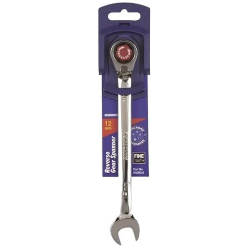 The Kincrome reversible gear spanner has all the benefits of standard spanners and more. The strong fine gear ratcheting ring end needs as little as 2.5° of sweep to move the fastener, a standard fixed ring end needs a minimum of 30°, or 12 times the area. Kincrome Gear Spanner ratcheting ring end has a Peripheral Drive™ configuration that virtually eliminates the rounding off of fasteners. The market leading narrow and thin head, combined with fine gear tooth design makes the Kincrome gear spanner suitable for working in tight and hard to access areas where a ratchet and socket will not fit. The reversible mechanism allows you to change the direction of the gears via the switch, and the 13° offset mimics the characteristics of a conventional combination spanner.