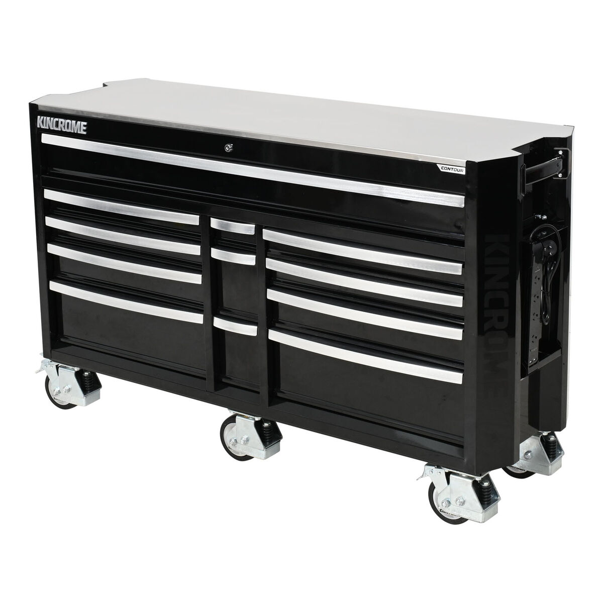 CONTOUR® storage comes standard with a range of premium features, including; the chamfered screen printed Kincrome side panels, ’Automatic Drawer Retention System (ADRS)’ locking system, heavy duty steel side handles, side folding work trays (including magnetic power boards), stainless steel worktops & heavy duty swivel castors for easy manoeuvrability.