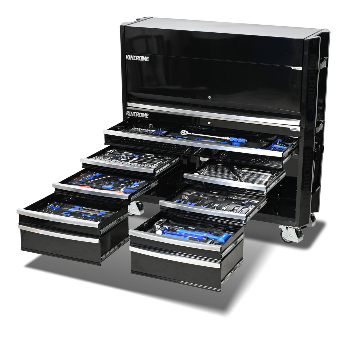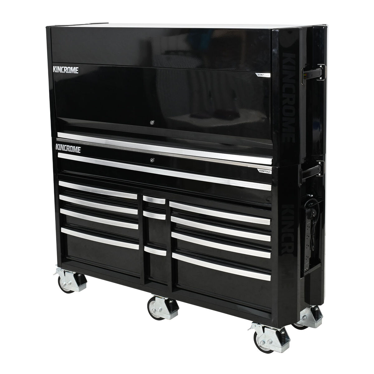 CONTOUR® storage comes standard with a range of premium features, including; the chamfered screen printed Kincrome side panels, ’Automatic Drawer Retention System (ADRS)’ locking system, heavy duty steel side handles, side folding work trays (including magnetic power boards), stainless steel worktops & heavy duty swivel castors for easy manoeuvrability.