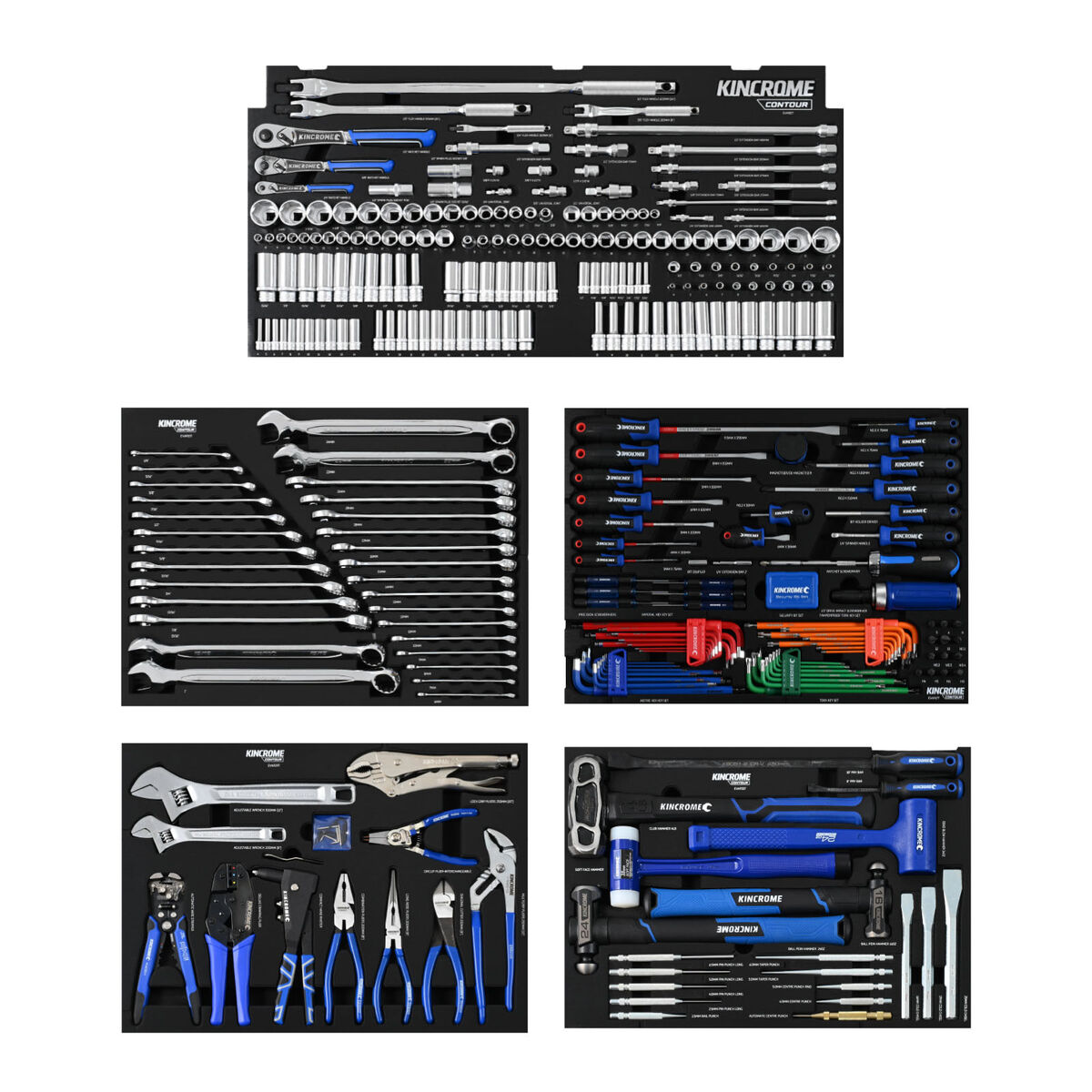 CONTOUR® storage comes standard with a range of premium features, including; the chamfered screen printed Kincrome side panels, ’Automatic Drawer Retention System (ADRS)’ locking system, heavy duty steel side handles, side folding work trays (including magnetic power boards), stainless steel worktops & heavy duty swivel castors for easy manoeuvrability.
