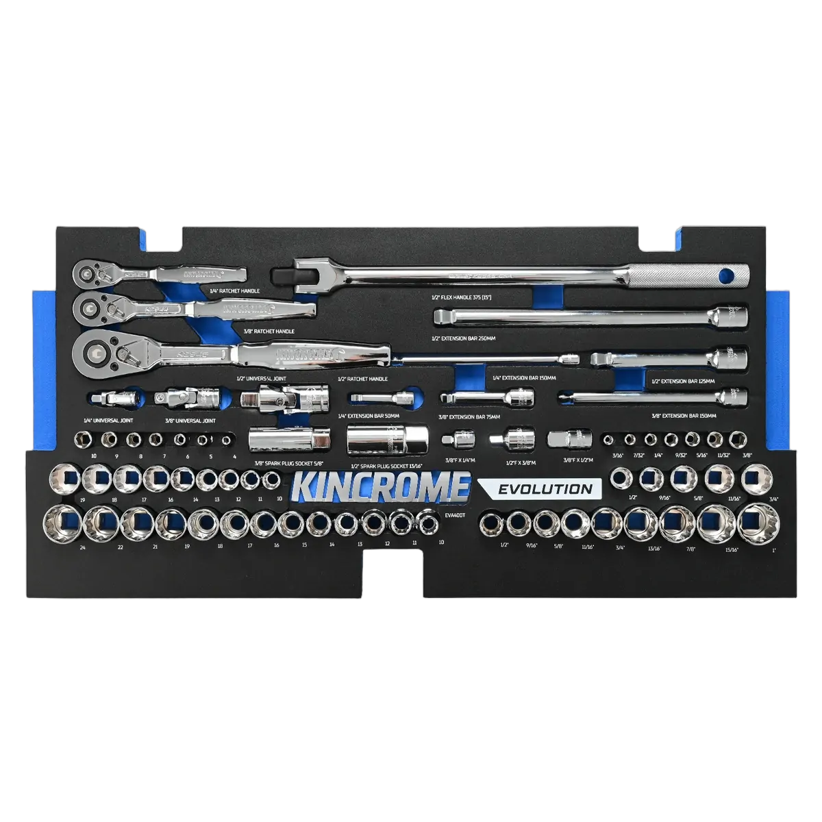- 9 Sockets 1/2” Square Drive: 1/2, 9/16, 5/8, 11/16, 3/4, 13/16, 7/8, 15/16, 1”