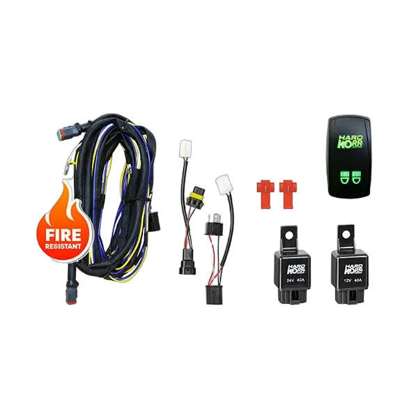 Plug-and-play dual wiring harness for use with all Korr® LED driving lights and light bars.