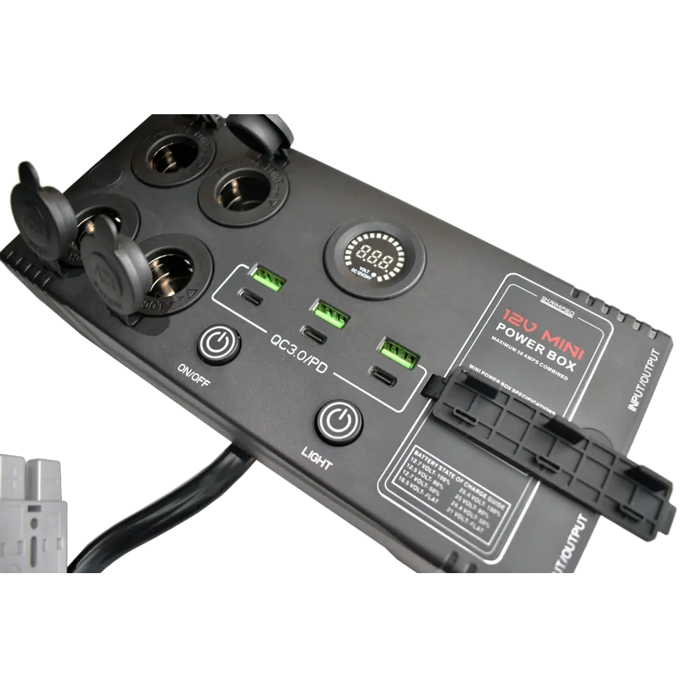 The distribution box includes five 12v accessory sockets and six USB outputs, with USB-C PD and QC 3.0 fast-charging options. These outlets are designed to handle common accessories such as portable fridges, LED lights, and digital devices within the rated capacity. An Anderson plug input/output with a 50A reset breaker provides a secure connection to your battery or solar supply. The inbuilt voltmeter lets you monitor battery status, while the integrated LED panel light with dimming helps when working at night.